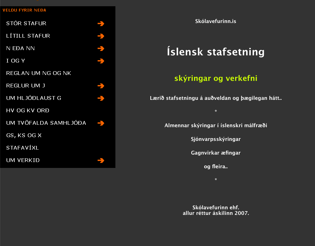 Hér getið þið nálgast valdar atriðabundnar gagnvirkar stafsetningaræfingar með nýju sniði. Æfingarnar henta jafnt fyrir venjulegar tölvur, spjaldtölvur og ekki síst snjallsíma. Eru þær einkum hugsaðar fyrir þá sem lengra eru komnir í stafsetningu og upplagðar fyrir þá sem vilja undirbúa sig fyrir framhaldsskólann.